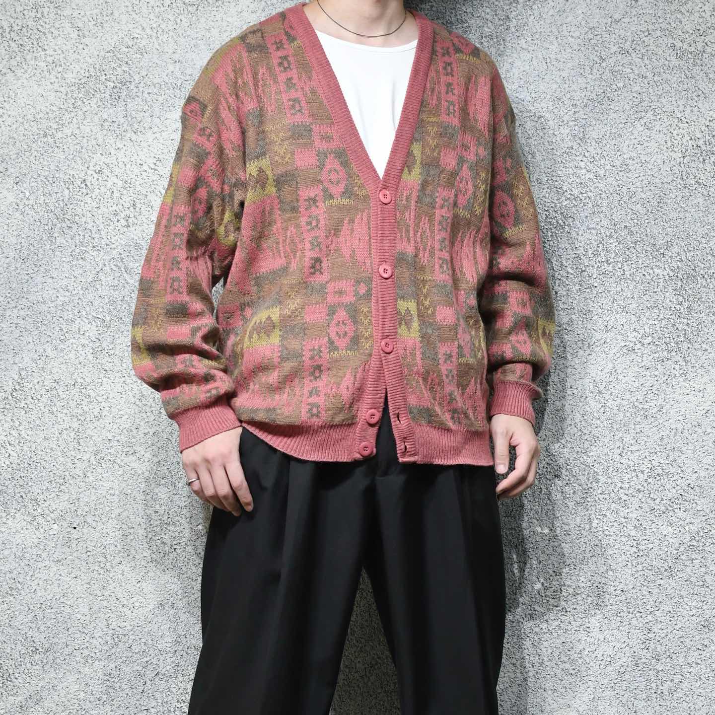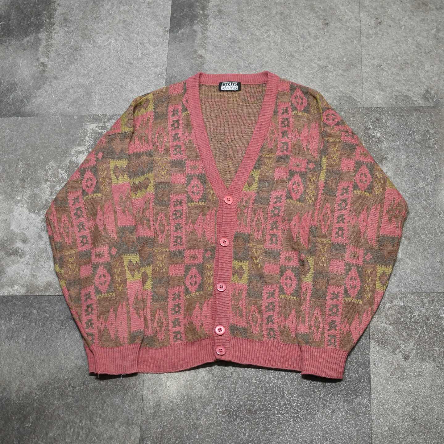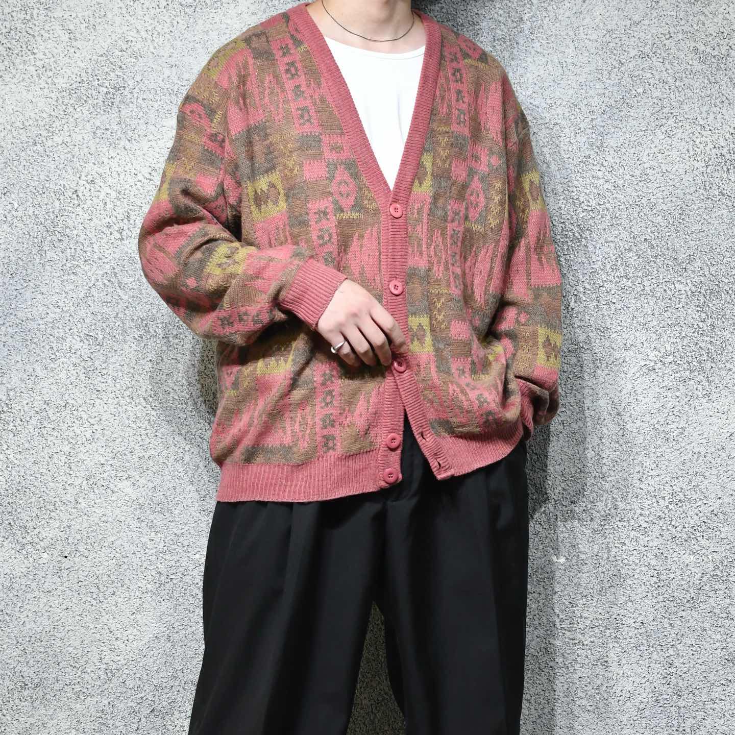 古着 アクリル コットン 幾何学模様 カーディガン セーター ニット 総柄 柄