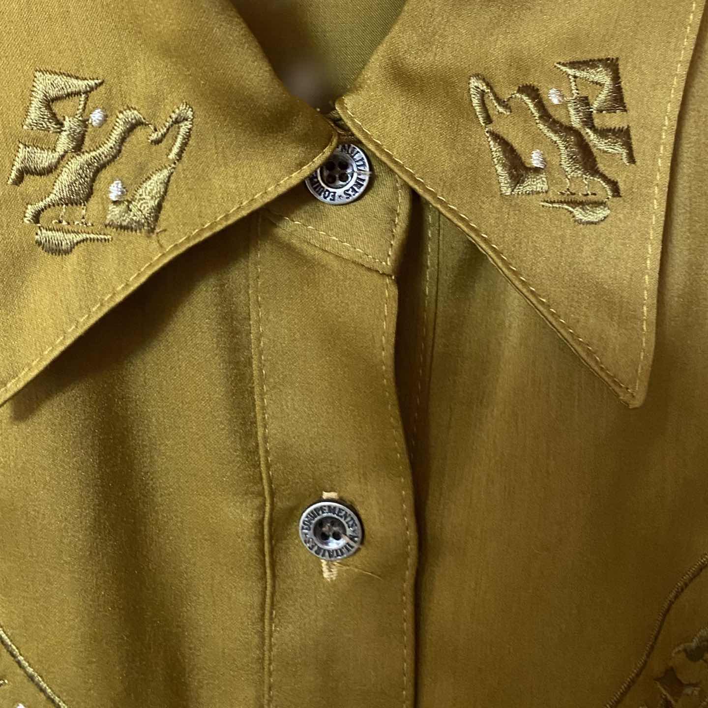 美品 60-70s ヴィンテージ チンスト 刺繍シャツ Vタグ ハ襟L シンプルに見えて、胸に刺繍が施されて売れてるギミックがかっこよすぎる。 題名だけでヴィンテージポイントはほぼほぼわかると思います。確実に60年代から70年代の激レアヴィンテージが デッドストックレベルの状態の良さで提供できます。 コーディネートのように柄シャツと合わせて、さらにヴィンテージのスラックスとこなれた感じのコーディネートにしましたが、1枚でも主役になりますし 重ね着すると、さらにファッションセンスは、爆上がりすること間違いないです。 寒暖差が激しいとかよく伺いますが、それ工夫しないからです。 例えばですよこのシャツをインナーに仕込み、ゆるだぼ リアル ウール等のカーディガンとかゆるだぼっと羽織れば寒暖差ってなんすか?でしょ? これは私見かもしれませんが、 よくおしゃれは引き算と言うじゃないですか? 逆です。 100%足し算です、だって重ね着しないと個性ってないでしょ? 引いたらTシャツ1枚じゃないですか、寒いじゃんって思いませ? 重ね着テクを揚げるコツは、シャツのテクニックを上げることなんでシャツは手を抜かないほうがいいです では検討ください ▷color◁ 光沢があるから、ゴールドにみえるかもですが、シルキーな からしに入ります ※ブラウザで異なる場合ありますがかなり実物には、近づけてます、 ▷size◁ 平置き片面採寸【㎝表記】 表記size Lくらい?? 着丈/75 身幅/56 肩幅/50DS 袖丈 /63↓ DSは袖はハンガー採寸 ※多少の誤差は理解下さい 170/Mジャスト体型の私が着て、✔️参考に ジャスト オーバーサイズ✔️ ビックサイズ 【素材】 強化シルキーポリ、最上級素材 【状態】 美品、デッドストックレベル 検品、洗濯、検品で、3回チェックして発送しますので、ご安心して、お買い求め下さい!!